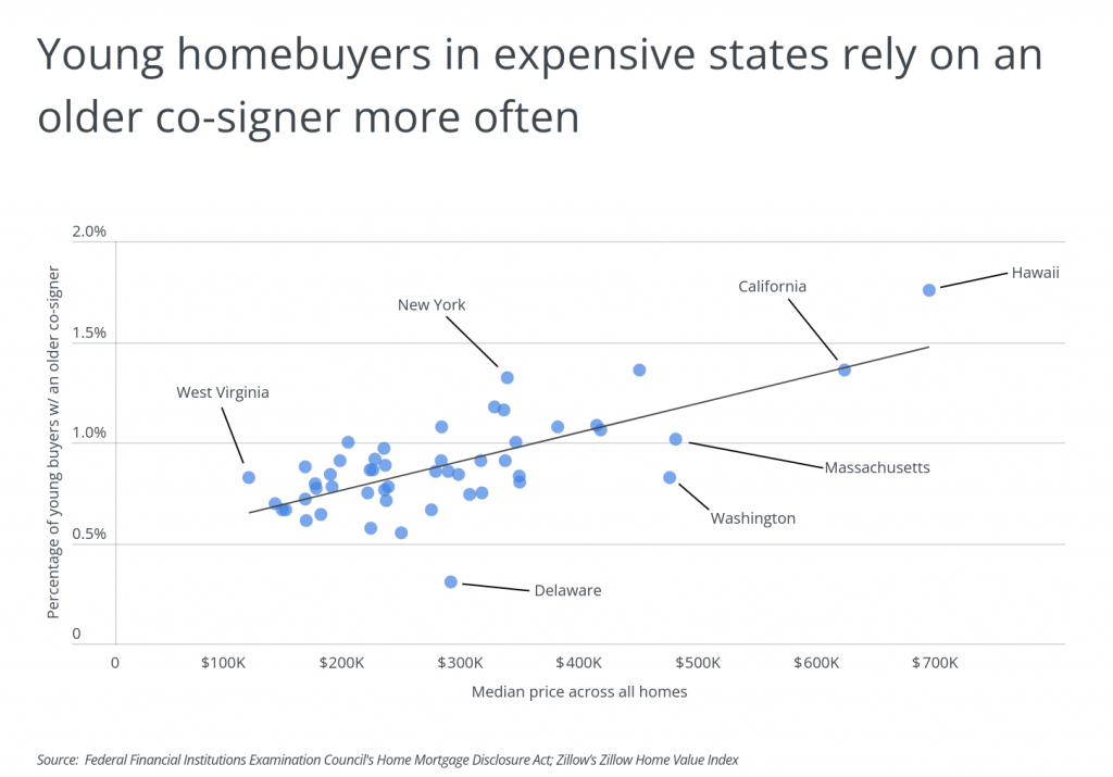 Co-signers are especially helpful to young buyers in markets that tend to be more expensive for housing. There is a positive correlation between median home price in a state and the percentage of young buyers with an older co-signer. The three states with the highest percentage of young buyers who have a co-signer—Hawaii, Colorado, and California—respectively rank first, fifth, and second in the U.S. for overall home prices.