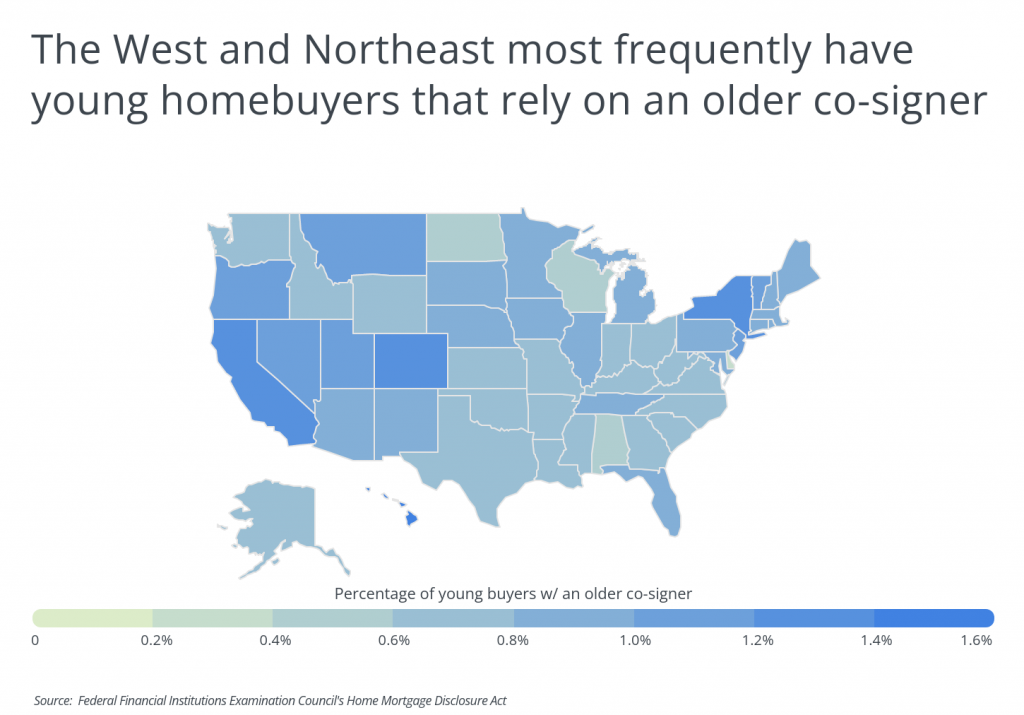 Due to the relationship between home prices and the presence of a co-signer, states in the West and Northeast that tend to be more expensive also tend to have younger buyers relying on co-signers more often. In contrast, more affordable states in the Southeast and Central U.S. have fewer young homebuyers with a co-signer.