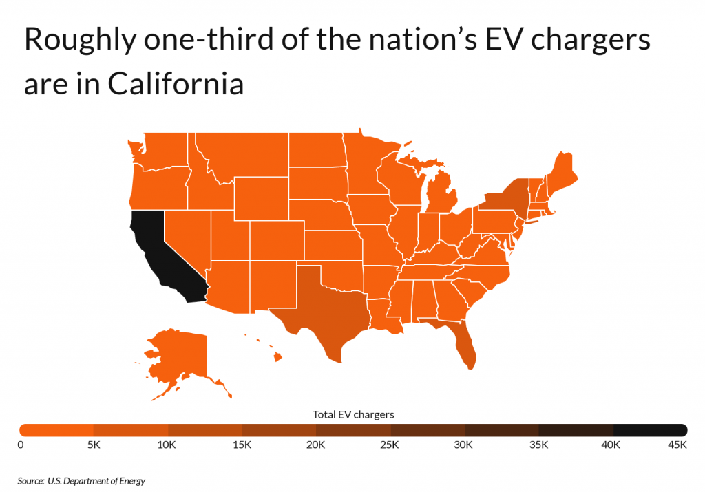 The U.S. electric charging infrastructure must also be distributed more evenly to encourage widespread adoption of electric vehicles. One state, California, currently far outpaces the rest of the country in the availability of chargers. California is home to 41,225 electric vehicle chargers, which amounts to approximately one-third of the nation’s total. As the birthplace of Tesla and one of the country’s most environmentally progressive states, California’s robust charging infrastructure is unsurprising. Nonetheless, other states lag far behind on this measure: second-place New York has less than one-fifth the number of EV chargers as California.
