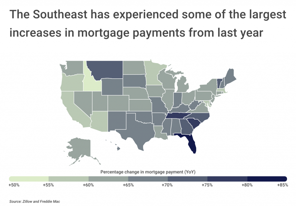 Both mortgage interest rates and home prices vary on a geographic basis. Additionally, some parts of the country have seen smaller declines in home prices than others. As a result, homebuyers in certain areas have been much more impacted by rising interest rates. On a regional level, the Southeast has experienced some of the largest increases in mortgage payments from last year. Out of the entire U.S., Florida homebuyers have been the most impacted by rising interest rates: mortgage payments for a median-priced home in Florida have increased by over 80% from 2021. South Carolina is close behind, with mortgage payments going up by 76%. While mortgage payments have risen dramatically across the U.S., the increase has been the smallest in Idaho and California, where mortgage payments have gone up by 52.3% and 56.3%, respectively.